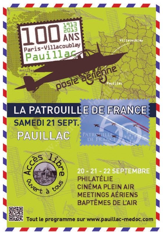 Les 21 et 22 septembre 2013 marqueront le point culminant de la commémoration du premier vol français de la poste aérienne, Villacoublay (Yvelynes) – Pauillac (Gironde).