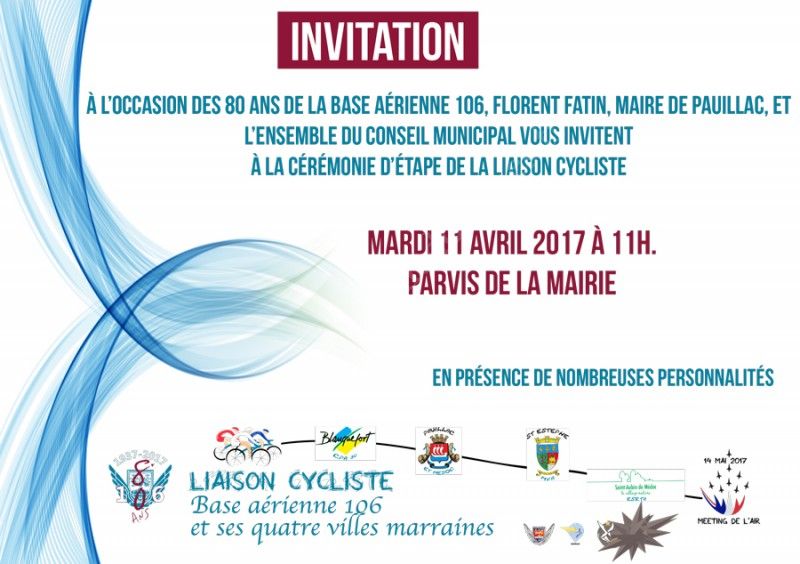 A l'occasion des 80 ans de la Base Aérienne 106, Florent Fatin, Maire de Pauillac, et l'ensemble du Conseil Municipal vous invitent à la Cérémonie d'Etape de la Liaison Cycliste.