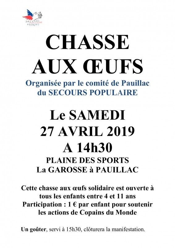 Le Secours populaire comité de Pauillac organise sa chasse aux oeufs le samedi 27 avril à la Plaine des Sports La Garosse à Pauillac.