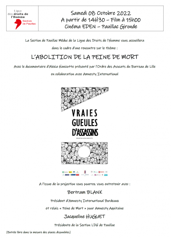 La Section de Pauillac Médoc de la Ligue des Droits de l’Homme vous accueillera dans le cadre d’une rencontre sur le thème : L’ABOLITION DE LA PEINE DE MORT
