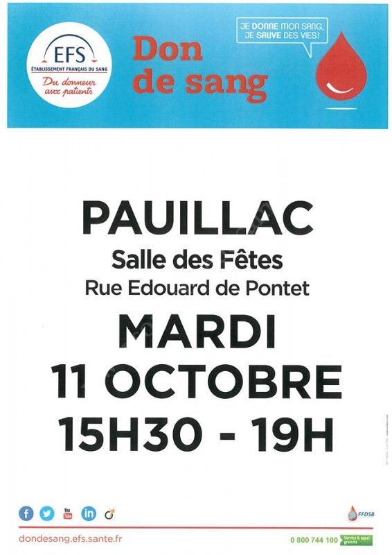 Venez donner votre sang à Pauillac le 11 octobre 2016, vous pourrez ainsi sauver des vies !!!