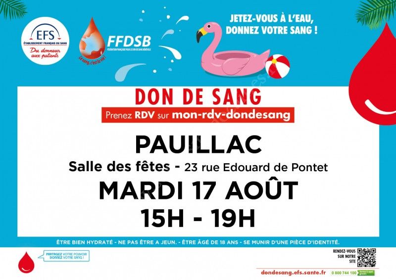 Venez donner votre sang à Pauillac le mardi 17 août 2021, vous pourrez ainsi sauver des vies !!!