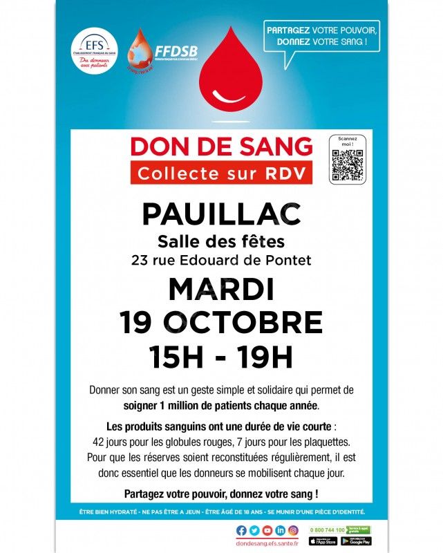 Venez donner votre sang à Pauillac le mardi 19 octobre 2021, vous pourrez ainsi sauver des vies !!!