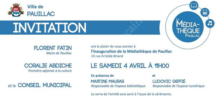 Florent Fatin (Maire de Pauillac), Coralie Abdiche (Première adjointe à la culture) et le Conseil Municipal ont le plaisir de vous convier à l'Inauguration de la Médiathèque de Pauillac.