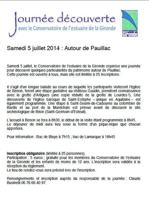 Participation : 5 euros ; gratuite pour les membres du Conservatoire de l’estuaire de la Gironde et les enfants de moins de 12 ans. L’inscription sera validée à la réception du règlement.