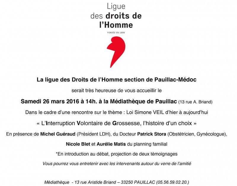 La Ligue des Droits de l'Homme, section Pauillac-Médoc, vous accueille dans le cadre d'une rencontre sur le thème : Loi Simone Veil d'hier à aujourd'hui "L'Interruption Volontaire de Grossesse, l'histoire d'un choix".