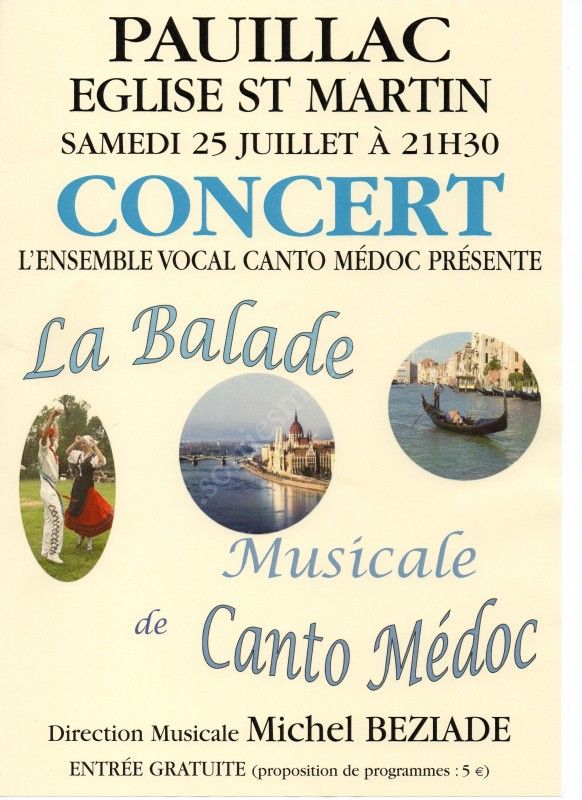 Une promenade musicale de l’Ensemble Vocal CANTO MÉDOC qui conduira l’auditeur de Venise (J. Offenbach) à Vienne (Le Danube Bleu) en passant par la Provence (chœur de magnanarelles extrait de Mireille de Gounod), le Pays Basque (deux chœurs d’hommes : Hégoak et Maita nun zira), Israël (Simi jadech), la Hongrie (Tabortuznel), l’Autriche (W.A Mozart : Piu non si trovano), deux chœurs célèbres : chœur de bohémiennes (La Traviata de Verdi), chœur des chasseurs (le Freischütz de Weber) etc…