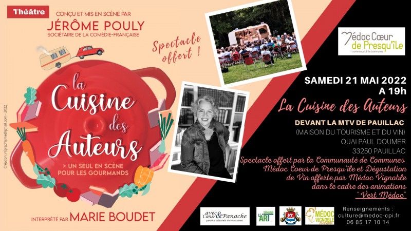 La Cuisine des Auteurs est une invitation gourmande à découvrir les liens entre de grands auteurs de la littérature française et la gastronomie, une ode littéraire au bon vivre mettant à l’honneur le patrimoine gastronomique et les produits locaux. Interprété par Marie Boudet, chaque représentation se prolonge par une rencontre-dégustation conviviale entre les spectateurs, l’interprète et les producteurs des territoires où elle est présentée.