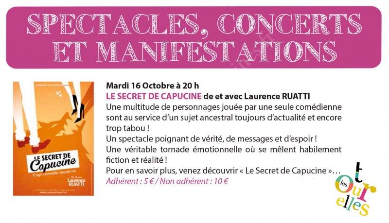Représentation de la tragi-comédie moderne "Le Secret de Capucine" de et avec Laurence Ruatti.