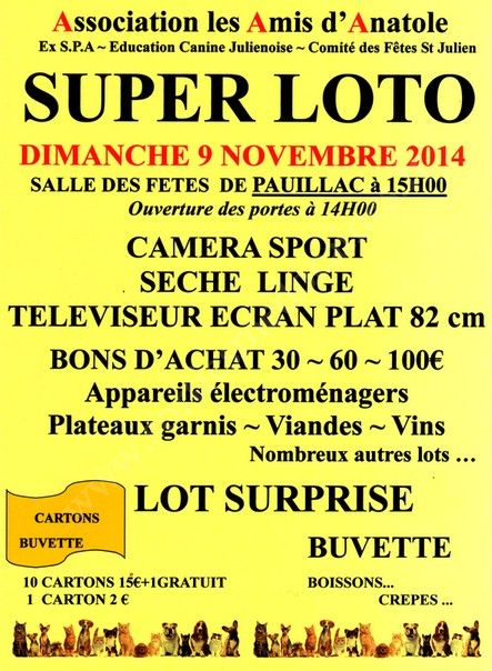 L'Association les Amis d'Anatole (ex. S.P.A. du médoc) organise son loto annuel au profit des animaux maltraités et pour aider à la régulation de la population féline médocaine.
