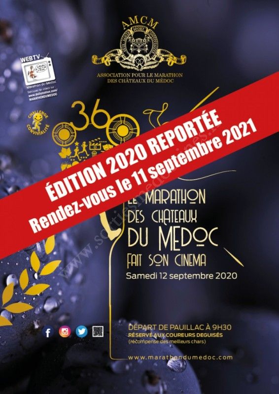 En 36 ans d’existence, notre Marathon des Châteaux du Médoc a traversé de nombreuses péripéties, chaque édition a eu son lot d’imprévus, et aucun n’est parvenu à entacher cet esprit festif et convivial qui le caractérise. Cette 36° édition qui se profile aura bien lieu ! Ce sera le samedi 11 septembre 2021 ! En effet, après concertation des autorités, du monde médical, des membres de notre association, des bénévoles et du monde du vin, nous avons conclu à l’unanimité que, face à la nécessaire distanciation physique et à l’incertitude de cette épidémie, pour préserver l’ADN du Marathon ainsi que la Confiance des bénévoles, des Châteaux, des Partenaires, des Coureurs et de la population médocaine, le 36° Marathon des Châteaux du Médoc est reporté d’un an, toujours avec la thématique du Cinéma.