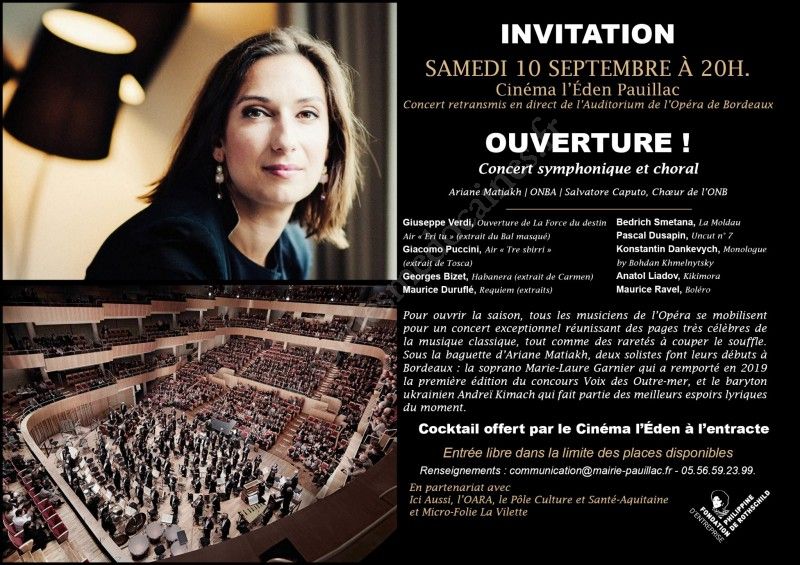 Pour ouvrir la saison, tous les musiciens de l’Opéra se mobilisent pour un concert exceptionnel réunissant des pages très célèbres de la musique classique, tout comme des raretés à couper le souffle. Sous la baguette d’Ariane Matiakh, deux solistes font leurs débuts à Bordeaux : la soprano Marie-Laure Garnier qui a remporté en 2019 la première édition du concours Voix des Outre-mer, et le baryton ukrainien Andreï Kimach qui fait partie des meilleurs espoirs lyriques du moment. Le concert du samedi 10 septembre est retransmis en direct en plein air à Bordeaux pour s’ouvrir à un plus large public, dans une ambiance décontractée.
