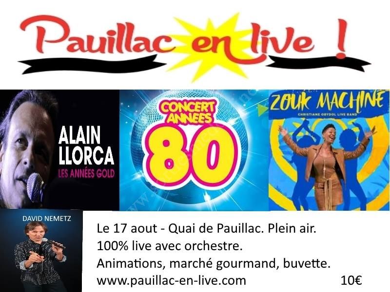 Edition 2018 de Pauillac en Live dédiée aux années 80 avec Zouk Machine et Alain Llorca du groupe GOLD, tous deux en live avec leurs orchestres. En premiere partie et Maître de Cérémonie, David Nemetz.