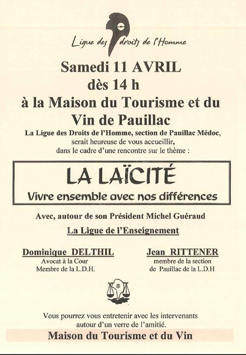 La Ligue des Droits de l'Homme, section de Pauillac Médoc, serait heureuse de vous accueillir, dans le cadre d'une rencontre sur le thème : La Laïcité, vivre ensemble avec nos différences.