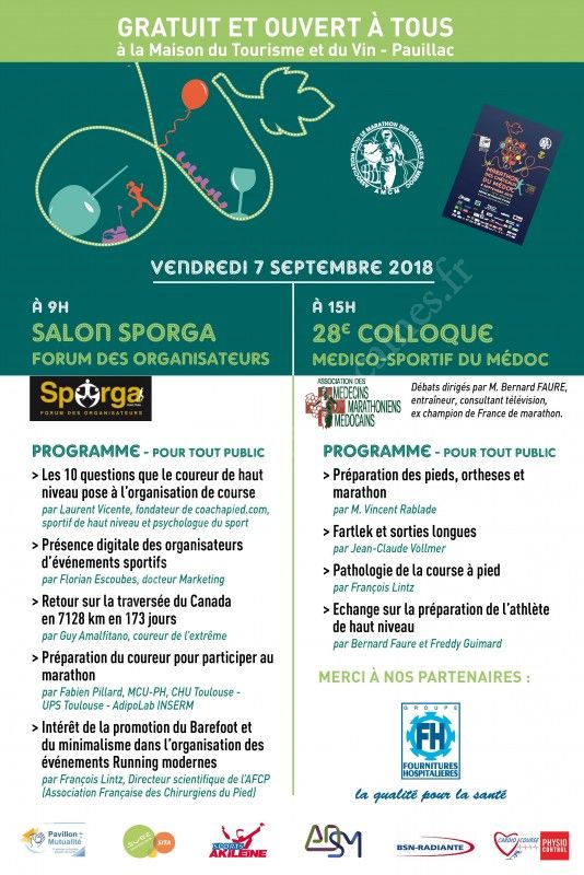 Forum des Organisateurs de courses à pied SPORGA et le 28ème Colloque médico-sportif du Médoc tous deux ouverts au public.
