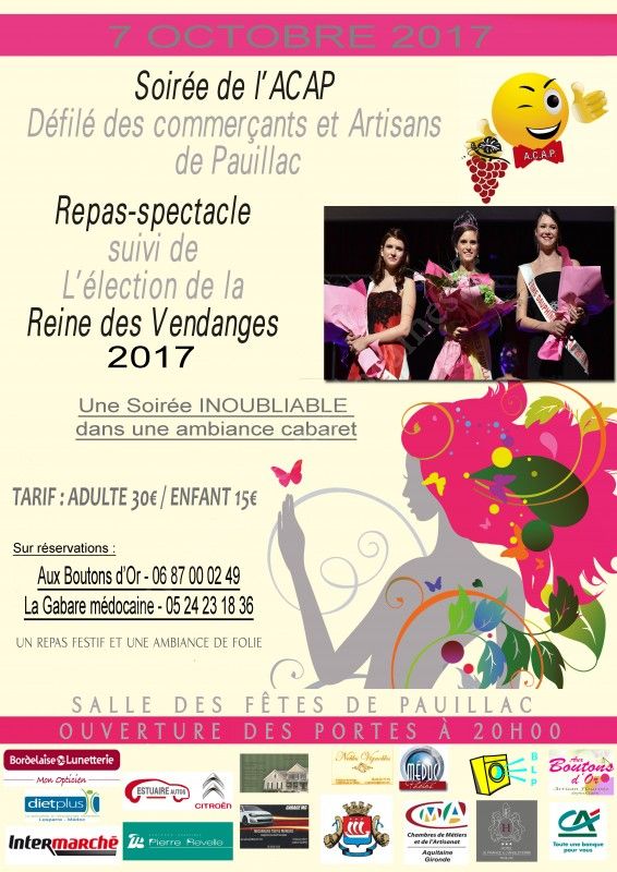 L'ACAP a le plaisir de vous proposer pour sa cinquième année consécutive sa grande soirée défilé des Commerçants et Artisans de Pauillac suivie de l'élection de la Reine des Vendanges 2017, le tout dans une ambiance survoltée sur le thème du cabaret.