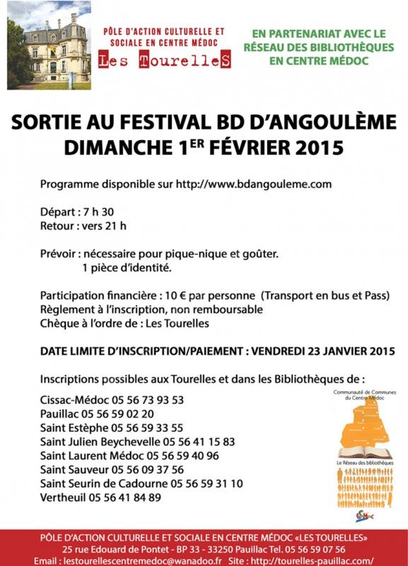 Le Pôle d'Action Culturelle et Sociale en Centre Médoc "Les Tourelles", en partenariat avec le Réseau des Bibliothèques du Centre Médoc, vous invitent à une sortie à Angoulême pour visiter le 42ème Festival BD d'Angoulême.