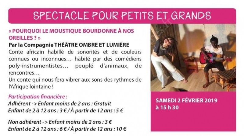 Il s'agit d'un conte africain habillé de sonorités et de couleurs connues ou inconnues, habité par des comédiens poly-instrumentistes. Un conte qui vous fera vibrer aux sons des rythmes de l'Afrique lointaine !"