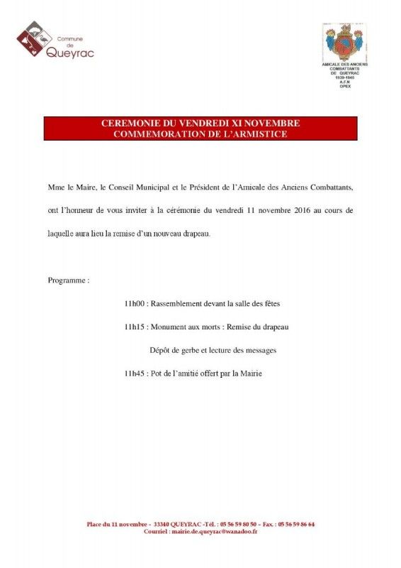 Mme le Maire, Le Conseil Municipal et le Président de l'Amicale des Anciens Combattants, ont l'honneur de vous inviter à la cérémonie du vendredi 11 novembre 2016 au cours de laquelle aura lieu la remise d'un nouveau drapeau.