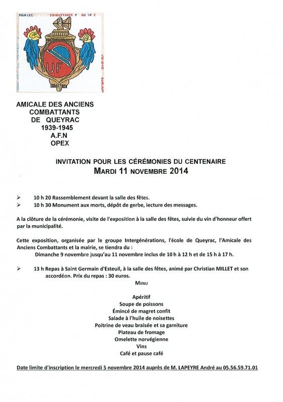 Cette exposition, organisée par le groupe Intergénérations, l'école de Queyrac, l'Amicale des Anciens Combattants et la mairie, se tiendra du : dimanche 9 novembre jusqu'au 11 novembre inclus de 10h00 à 12h00 et 15h00 à 17h00.