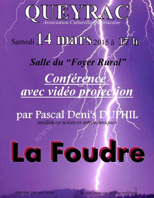 L'Association Culturelle Queyracaise vous propose : une conférence avec vidéo projection sur "La Foudre" par Pascal Deni's Duphil - médiateur sciences astronomiques.