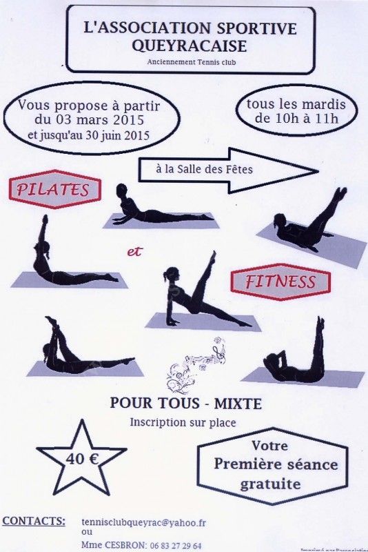 NOUVEAUTE : cours de Pilates et stretching tous les mardis matins de 10 à 11 heures à la salle des fêtes de QUEYRAC à partir du mardi 3 mars 2015 jusqu'à fin juin.