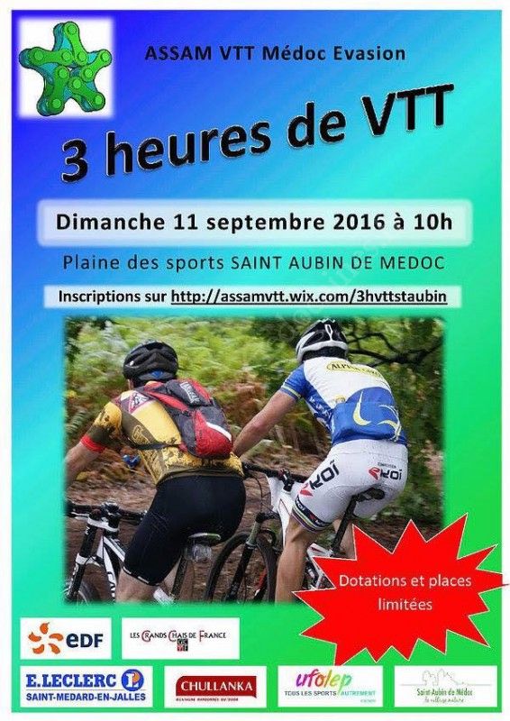 Les 3 heures VTT de Saint Aubin De Medoc est une épreuve VTT de type compétition. Elle se déroulera le Dimanche 11 septembre 2016 sur la commune de Saint Aubin De Medoc (33), dans la forêt proche du stade. Le départ sera donné au niveau du parcours de santé.