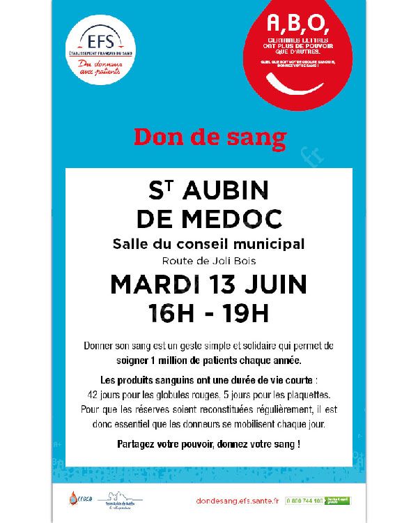 Venez donner votre sang le mardi 13 juin 2017 à Saint-Aubin de Médoc, vous pourrez ainsi sauver des vies !!!