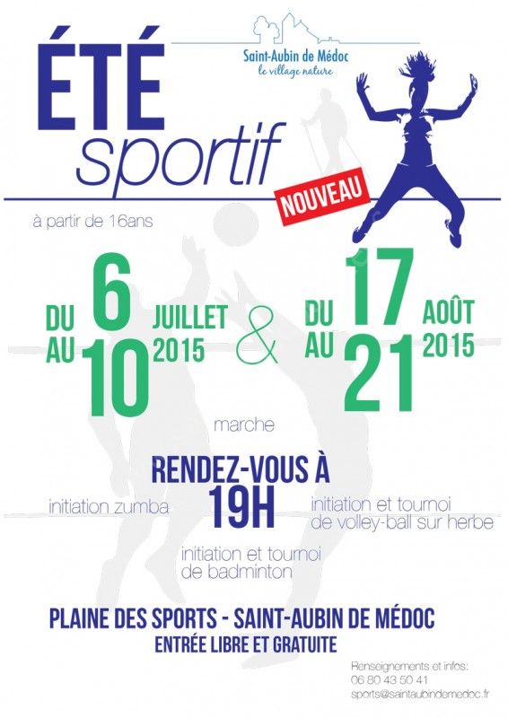 Le service des sports de la municipalité de Saint-Aubin de Médoc, propose de venir découvrir et pratiquer différentes activités sportives à la plaine des sports. Ces activités seront ouvertes, sauf indication contraire, aux personnes âgées de plus de 16 ans. Pour cette première année seront proposées les activités de marche (rapide et nordique), de badminton, de volley sur herbe et de zumba. Les Comités départementaux de volley-ball et de badminton, et l’ASSAM nous accompagnent afin de mettre ce projet en place.