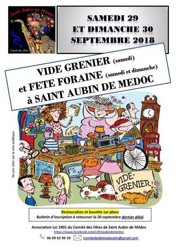 Bulletin d'inscription pour le vide-grenier téléchargeable plus bas et à renvoyer au plus tard le 20 septembre 2018.