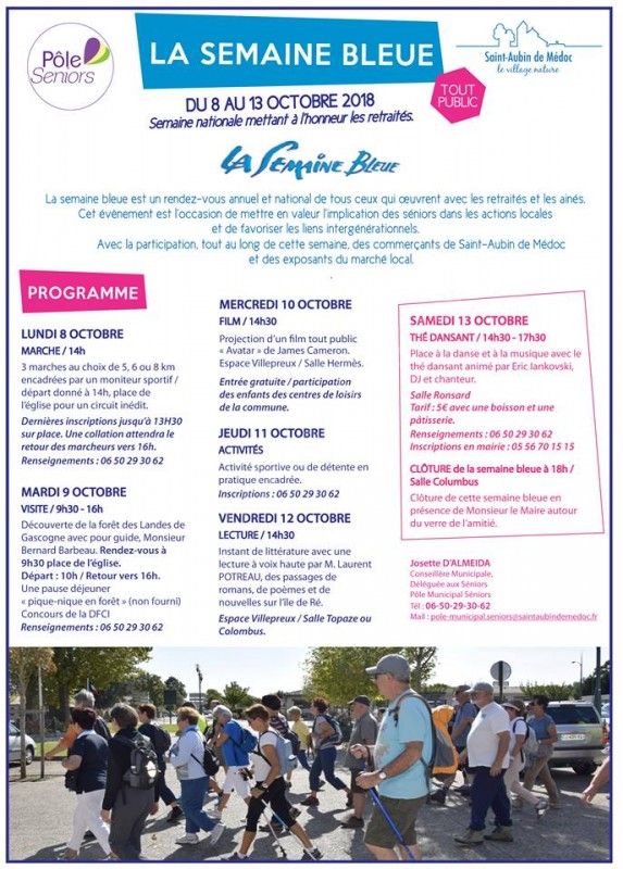 - 18h00 : Clôture de la Semaine Bleue (Salle Columbus) en présence de Monsieur le Maire autour du verre de l'amitié.