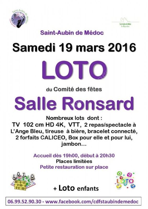 Retrouvez de nombreux lots à gagner dont : une TV HD, un VTT, 2 repas-spectacle au cabaret l'Ange Bleu, un bracelet connecté, 2 forfaits au Caliceo, une box pour elle et une box pour lui, une tireuse à bière... et bien sûr, l'éternel jambon !
