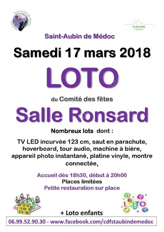 Ouverture des portes à 18h30, début du loto à 20h00. Pas de réservations.