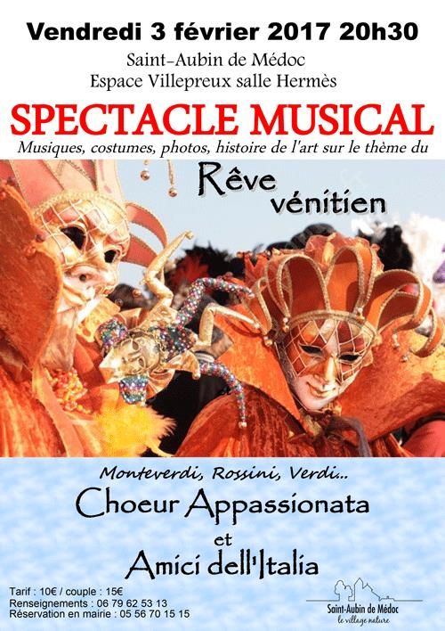 Vendredi 3 février 2017, les associations Amici dell' Italia et Le Choeur Appassionata vous proposent une découverte commentée et chantée de l'Italie, agrémentée d'une présentation de costumes vénitiens et d'une exposition photos.