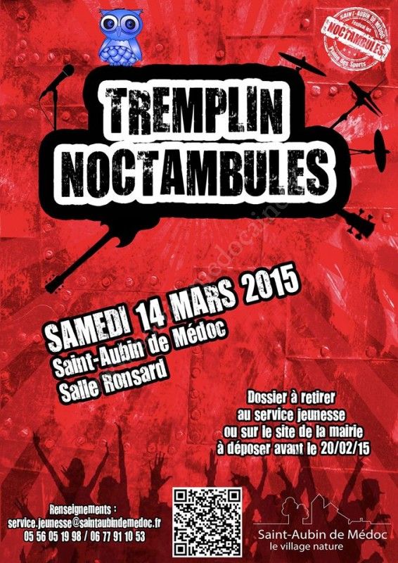 « Le Tremplin des Noctambules 2015 », c’est l’occasion donné à un groupe de se produire, sur la scène principale du festival des Noctambules qui aura lieu le samedi 30 mai 2015 sur la plaine des sports de Saint-Aubin de Médoc.