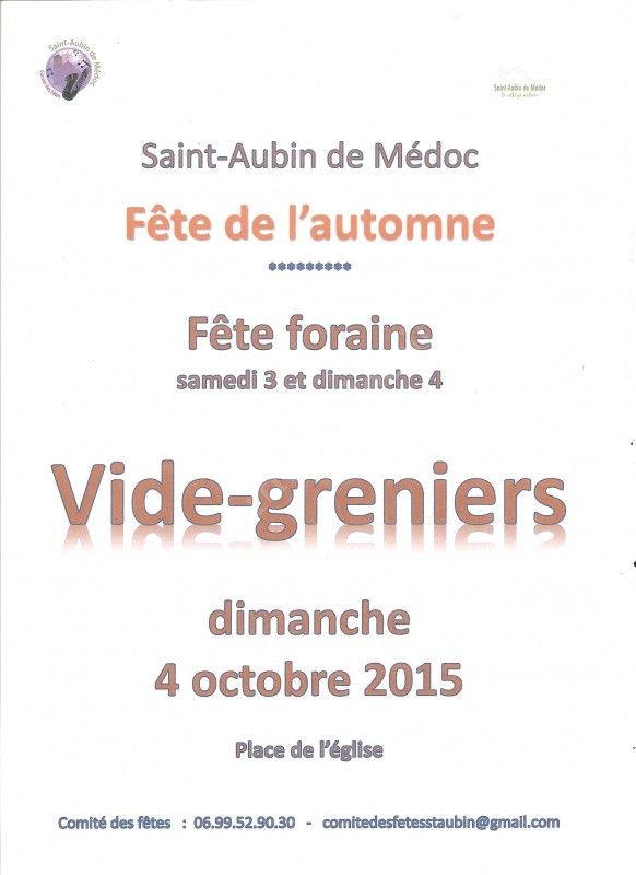 Pour avoir accès aux emplacements, les exposants devront avoir rempli les formalités administratives et avoir acquitté leur inscription. Bulletin d'inscription sur simple demande par téléphone ou par messagerie auprès du Comité des fêtes ou à l'accueil de la mairie de Saint-Aubin de Médoc. Inscription avant le 30 septembre 2015. Bulletin à transmettre, accompagné du montant correspondant et de la copie de la pièce d'identité, à : Vide-greniers du CdF, Mairie, route de Jolibois - 33160 SAINT-AUBIN DE MEDOC. Le dossier d'inscription peut également être déposé à l'accueil de la mairie de Saint-Aubin de Médoc.