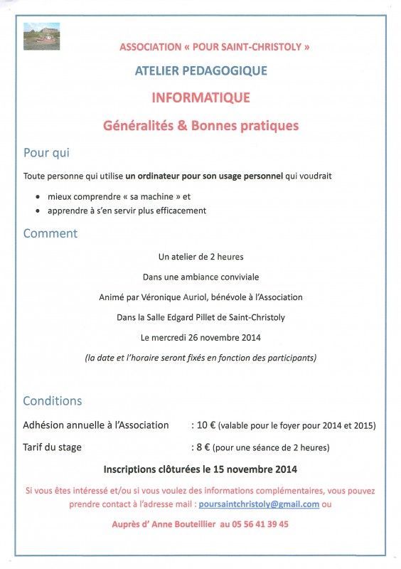 l’Atelier pédagogique « Informatique : Généralités & Bonnes pratiques » organisé par l’association « Pour Saint-Christoly »