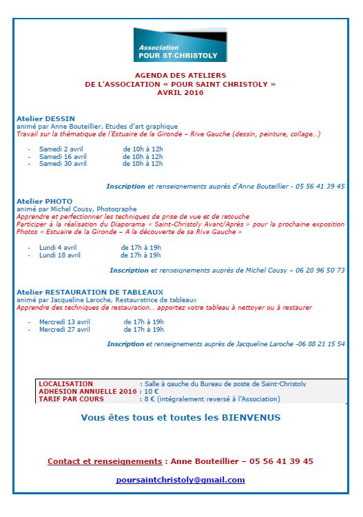 Atelier restauration de tableaux animé par Jacqueline Laroche, pour apprendre les techniques de restauration… Apportez votre tableau à nettoyer ou à restaurer. De 17h à 19h à la salle communale de SAINT-CHRISTOLY. Tarif : 8€/pers. Renseignements : 05 56 41 39 45
