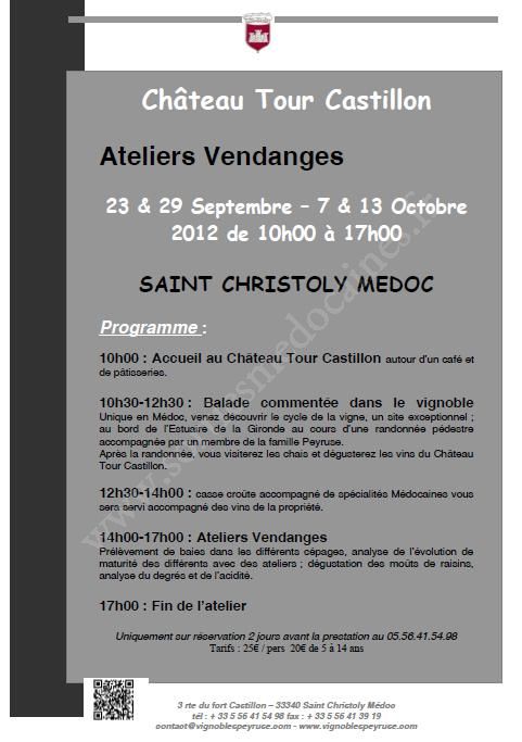- 10h30-12h30 : Balade commentée dans le vignoble Unique en Médoc, venez découvrir le cycle de la vigne, un site exceptionnel ; au bord de l’Estuaire de la Gironde au cours d’une randonnée pédestre accompagnée par un membre de la famille Peyruse. Après la randonnée, vous visiterez les chais et dégusterez les vins du Château Tour Castillon.