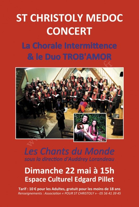 Une soixantaine de choristes chanteront un répertoire de CHANTS DU MONDE sous la direction d’Audrey Lorandeau, accompagnés par le duo "Trob'Amor".