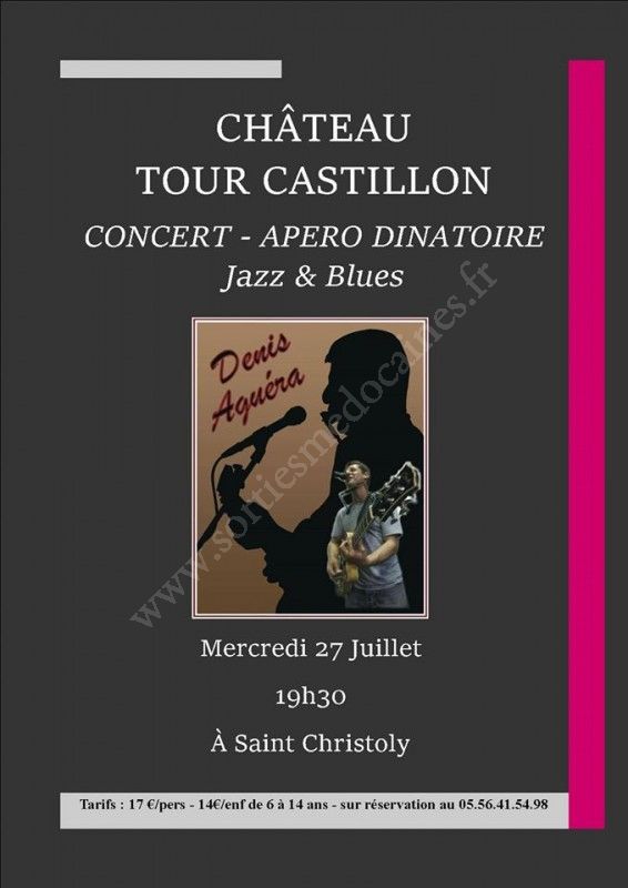 Dans un cadre exceptionnel au bord de l'Estuaire (selon conditions climatiques), venez vivre un concert de Denis Aguera, inoubliable autour des vins du Château Tour Castillon accompagnés de tapas salés et sucrés.