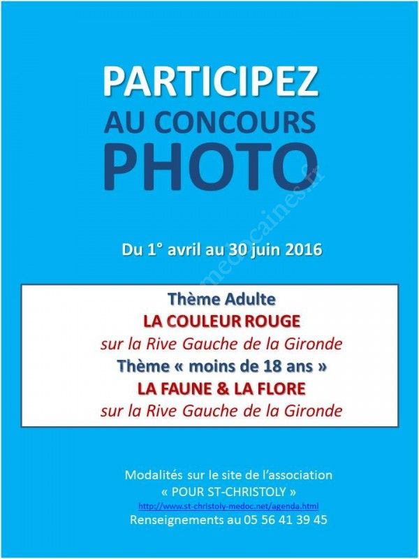CONCOURS PHOTO organisé par l’Association « POUR ST CHRISTOLY » dans le cadre de l’Exposition Photo « ESTUAIRE DE LA GIRONDE – A la Découverte de sa Rive Gauche » qui se déroulera du samedi 10 septembre au Dimanche 25 septembre 2016 à l’ECEP de Saint-Christoly.