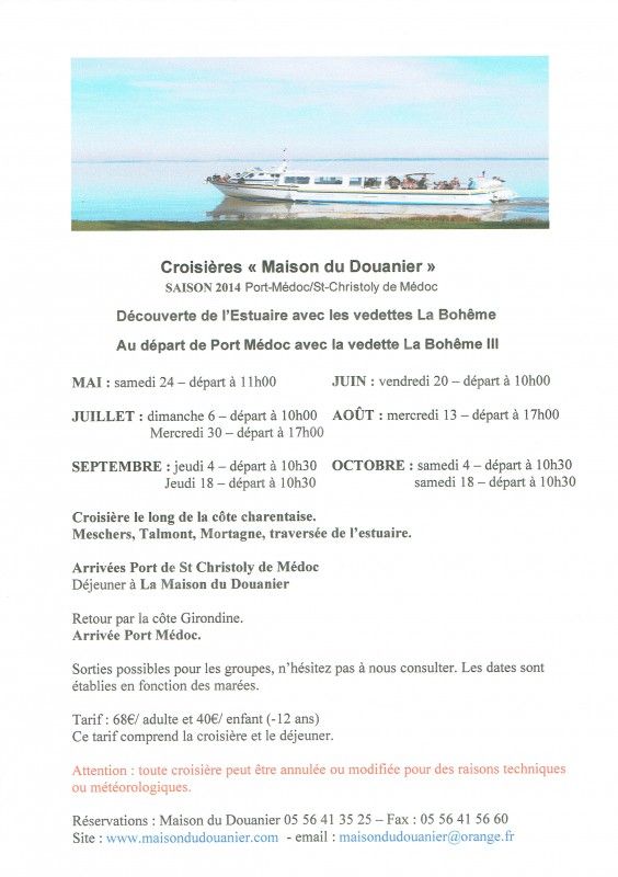 départ de Port Médoc à 10h30, croisière le long de la côte charentaise, puis arrivée au port de ST-CHRISTOLY pour un dîner à la Maison du Douanier, enfin retour par la côte girondine et arrivée à Port Médoc.