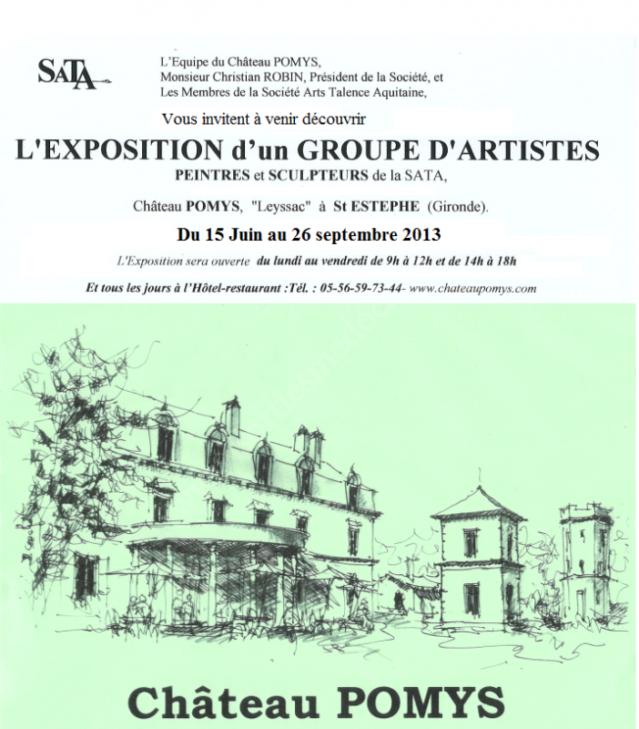 L'équipe du Château Pomys, Monsieur Christian Robin, Président de la Société, et les membres de la Société Arts Talence Aquitaine vous invitent à venir découvrir l'exposition d'un groupe d'artistes peintres et sculpteurs de la SATA.