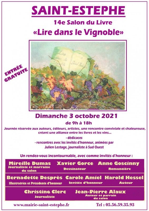Vous pourrez rencontrer et partager avec les auteurs, maisons d’éditions et les invités d’honneur, ce mystère de la lecture et la dédicace de leurs ouvrages. Des ateliers pour les enfants, des conférences, mais aussi savourer l’extraordinaire diversité de nos crus de SAINT ESTEPHE. Cette dégustation, ce voyage qui raconte une histoire, un terroir, un homme et son talent que sont nos viticulteurs stéphanois.