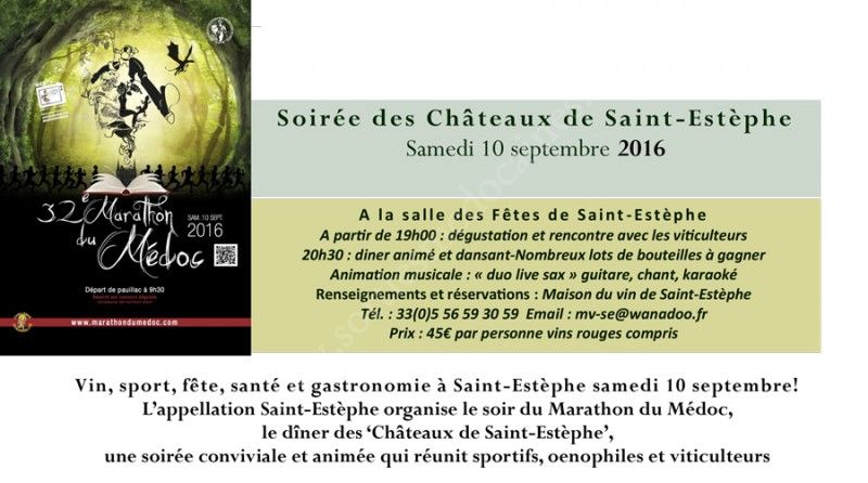 Le jour du marathon, samedi 10 septembre 2016 aura lieu « le dîner des châteaux de Saint-Estèphe » devenu au fil des années, un rendez-vous incontournable pour les amateurs des vins de l’appellation.
