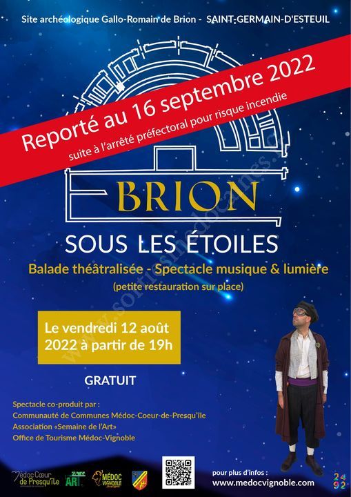 A 20h15, vous partirez pour une balade sur le site gallo-romain de Brion en déambulant à travers les vestiges antiques d’un théâtre, d’une villa, d’une rue et d’un temple… Au fil de la promenade des artistes vous raconteront une histoire de l’époque de Jules César… un peu loufoque peut-être et pour toute la famille.
