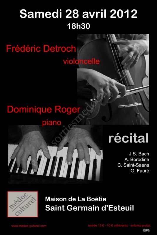 Suite N°1 pour violoncelle seul de Jean Sébastien Bach, sonate d'Alexandre Borodine pour violoncelle au piano composée à Heidelberg, 1er mouvement du concerto de la sonate pour violoncelle au piano de Camille Saint-Saens, ainsi que Gabriel Fauré avec Elégie, Sicilienne et Papillon......dans le récital que donneront Frédéric Detroch et Dominique Roger.