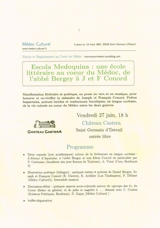 Escola Medoquina : une école littéraire au cœur du Médoc, de l’abbé Bergey à J & F Conord à 18h au Château Castéra à SAINT-GERMAIN-D’ESTEUIL.