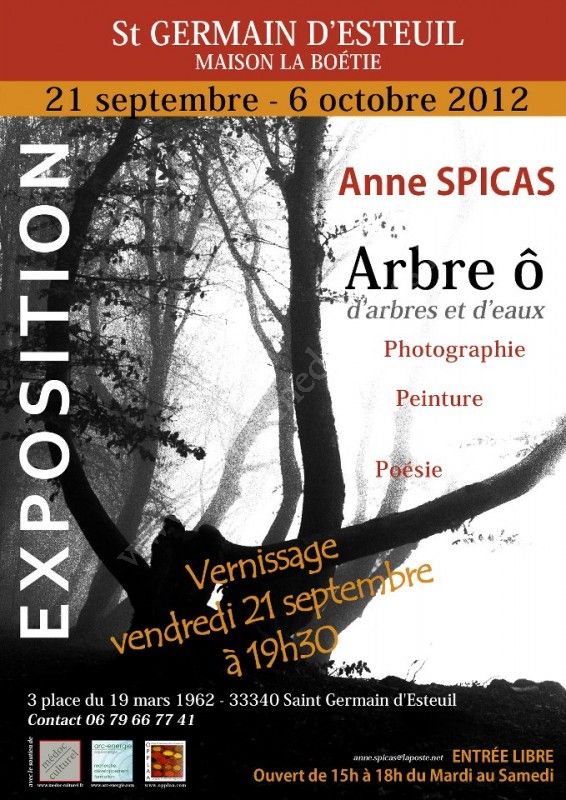Exposition de photos, peintures et poèmes d'Anne Spicas, artiste-peintre, photographe et poète Francilienne qui rejoint le Médoc pour y exposer un choix de photos sur son thème préféré : l'arbre et ce qui le fait vivre - la terre, l'eau, la lumière.
